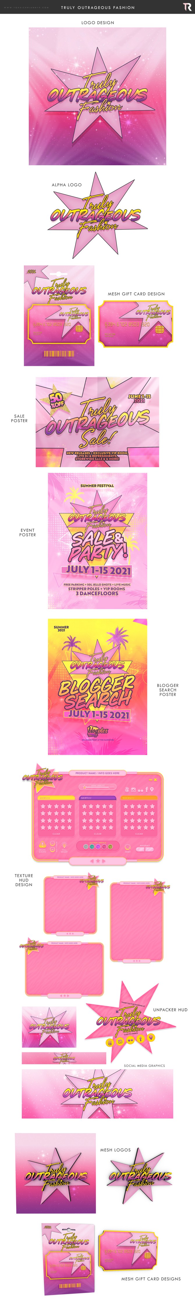 My final design packages include all files seen in the preview. In psd, jpeg, ai, png, dae, obj, maya scene and inworld objects provided for example purposes, alongside textures and material maps where needed. The whole order is carefully curated and designed to match the customers references for Jem and the Holograms. My packages are delivered inworld with mesh objects and then organized in folders to ensure easy unpacking with a downloadable file.