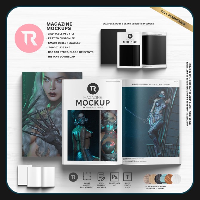 New! TR Magazine Mockup ♡ 2 psd files w/ smart object enabled photo slots. Easy to replace with your own images or create new layouts! I can see these being awesome for vendor ad layouts or blogger photos! Save as a jpg or alpha png. Play around and create a whole new look and feel 🙂