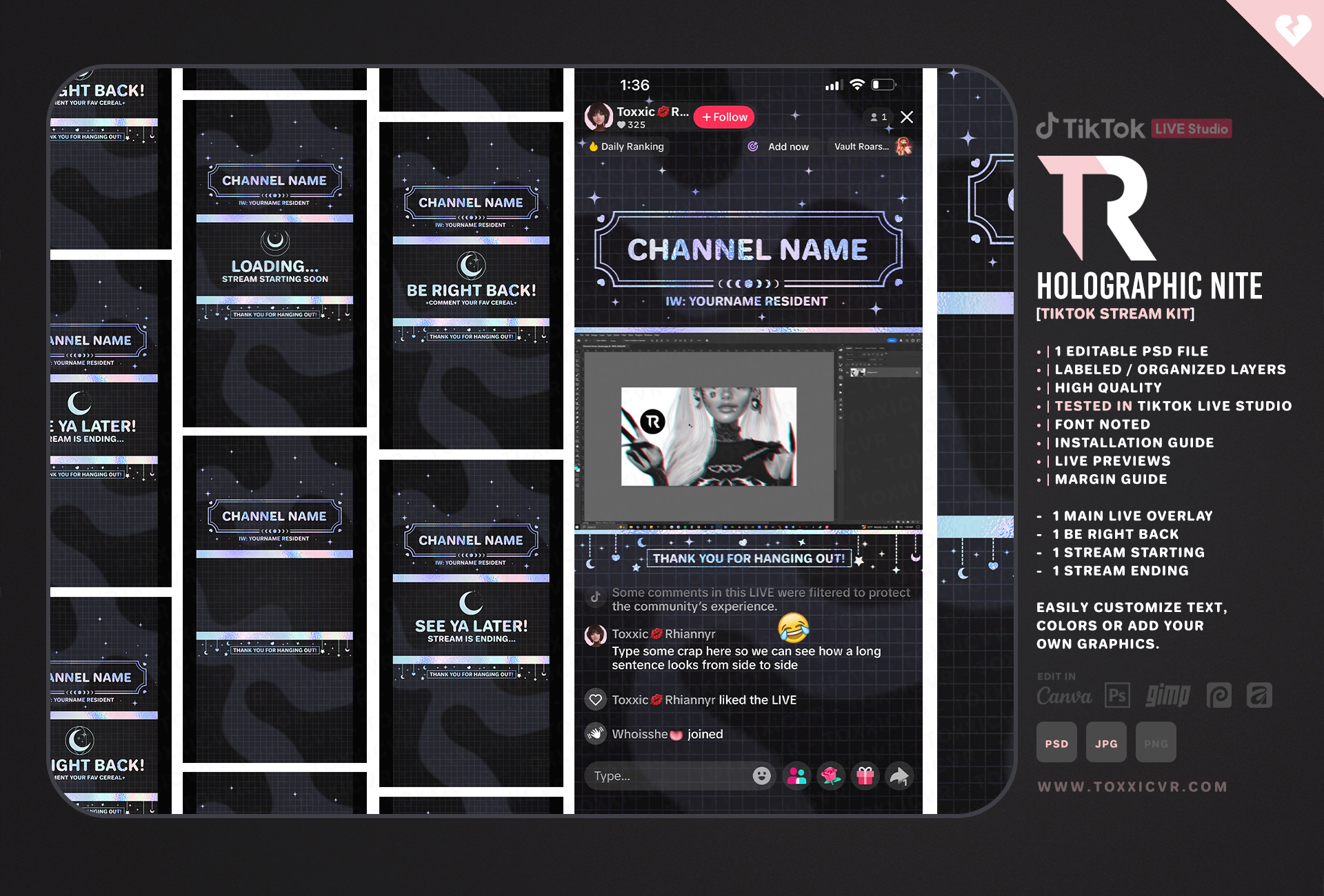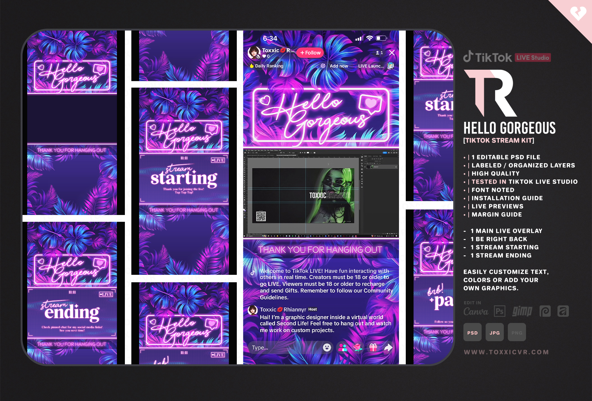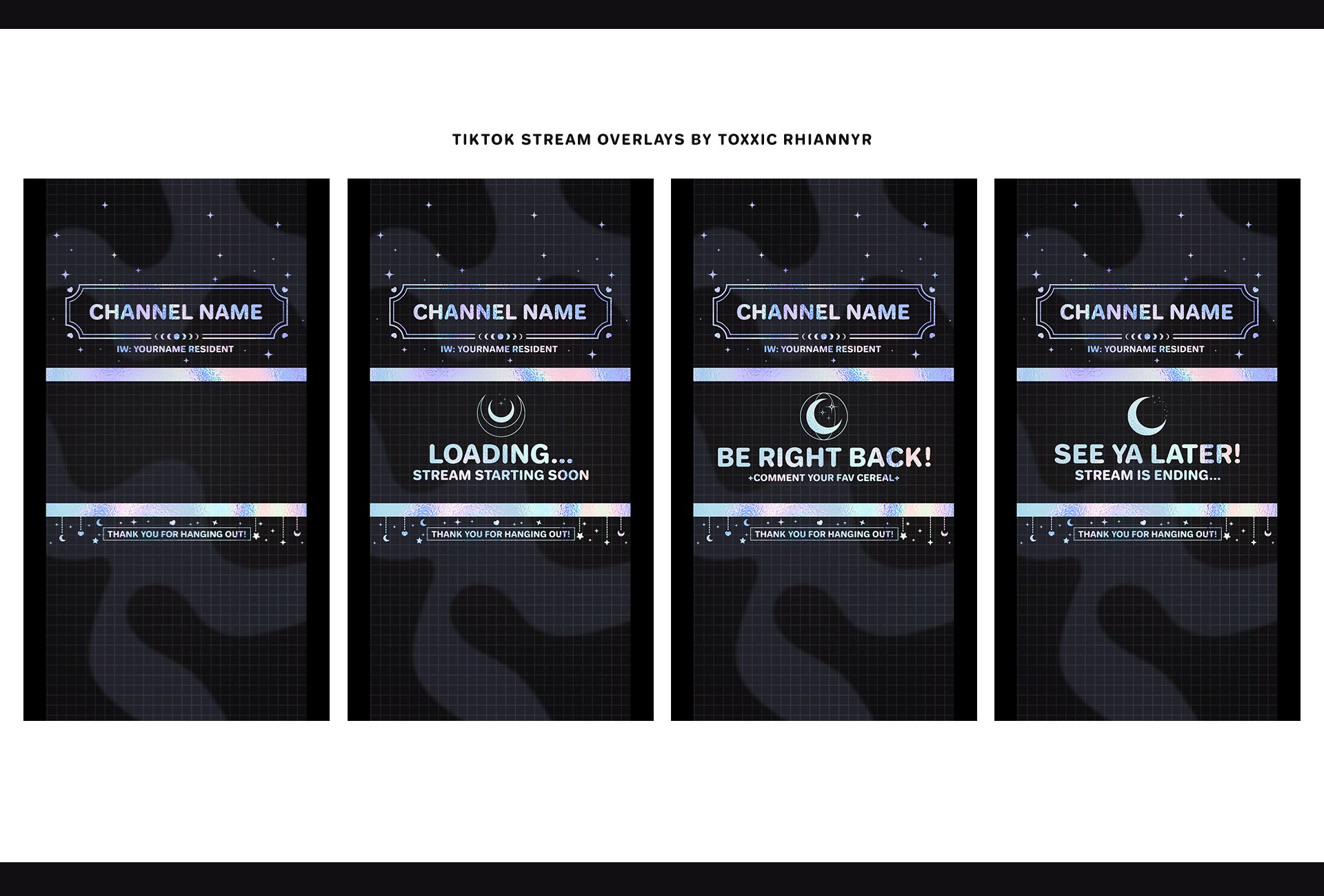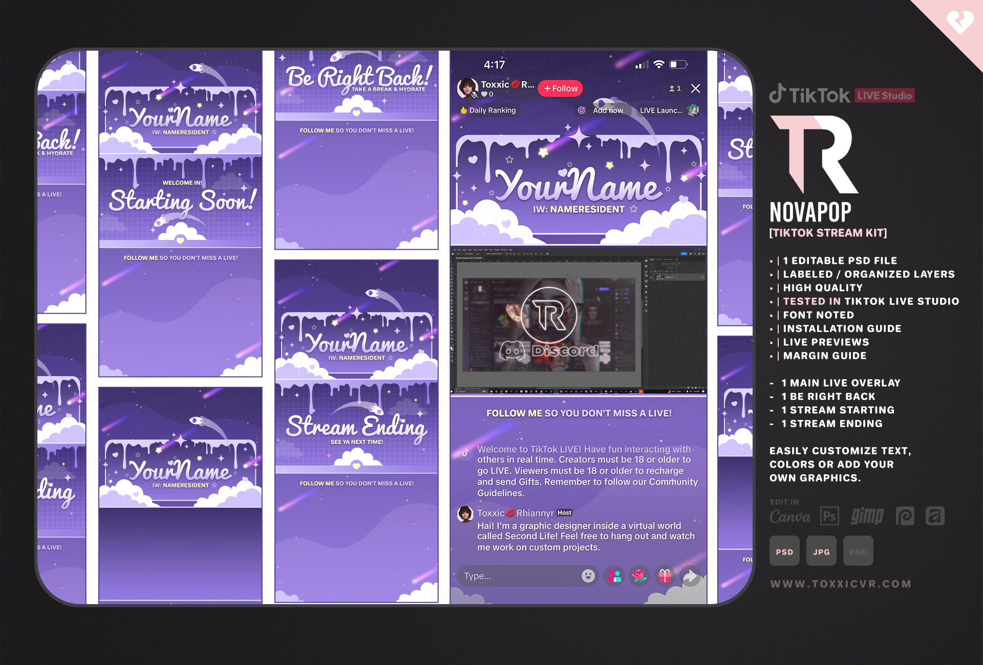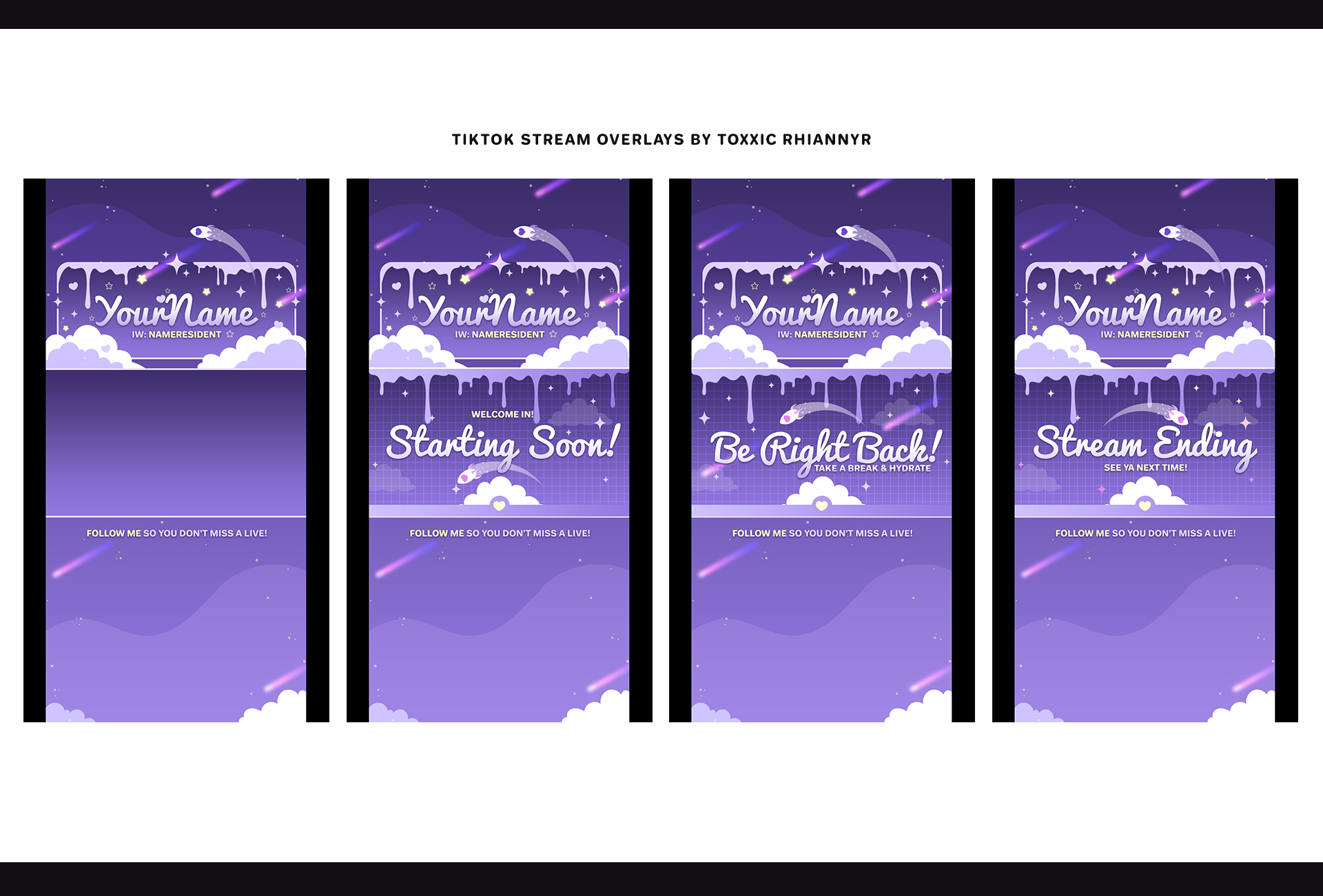 Each kit includes easy-to-follow instructions for installing the themes in TikTok Live Studio. They’re super simple to customize, swap in your name, adjust layouts, and change colors to fit your vibe with ease. I am selling these premades on SL Marketplace & Gumroad, as VRChat players are there as well ♥